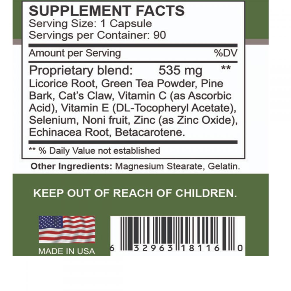 Ingredients: flaxseed, green tea, pine bark, noni, echinacea, cat’s claw, beta carotene and vitamins E, C and selenium.